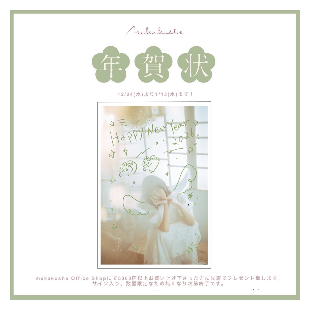 Happy New Year 2026 ‼︎ いつもmekakushe official shopをご利用くださりありがとうございます。(ここのおかげで生きていけています✴︎) 今年もmekakusheは頑張ります★ミ だからずっと見守っていてね! mekakusheより ___ 2026年、新年撮り下ろしinstax。 日付とサイン入り。 ___ ✴︎年賀特典あります✴︎ 【期間:12/24(水)-1/13(水)】 毎年、行っている年賀企画。2026年は午年(うまどし)!mekakusheにやる手書きイラストが印刷されたサイン入り年賀を今年もプレゼントします。5000円以上お買い上げで、数量限定になりますのでお早めに!
